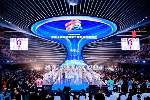華燈璀璨,掌聲如潮。9月23日晚,當(dāng)348名獲獎選手高舉隊旗與獎?wù)?,?dāng)大賽會旗在璀璨的舞臺上完成交接傳遞,當(dāng)良渚文化和人形機器人在現(xiàn)場8000余名觀眾的歡呼聲中共舞……中華人民共和國第三屆職業(yè)技能大賽閉幕式在鄭州奧體中心體育館完美落幕!